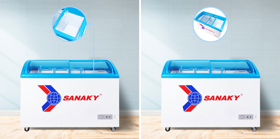 Tủ đông sanaky có nắp kinh trưng bày phù hợp với các khách hàng lựa chọn tủ cho các siêu thị, cửa hàng bách hóa,... các loại tủ trong dòng này vừa đáp ứng được nhu cầu bảo quản thực phẩm lại vừa là một chiếc tủ trưng bày sản phẩm. Khách hàng có thể dễ dàng quan sát, lựa chọn thực phẩm bên trong tủ qua lớp kính mà không cần phải mở tủ. Sản phẩm giúp tiết kiệm một lượng lớn điện năng tiêu thụ trong quá trình mở tủ. Tuy nhiên giá thành thường cao hơn các sản phẩm có cùng dung tích có thiết kế nắp lật vali.