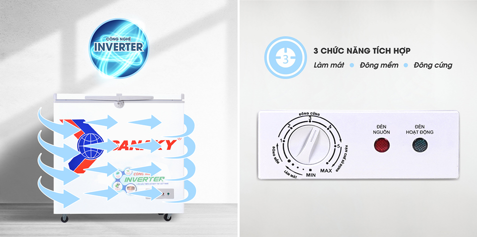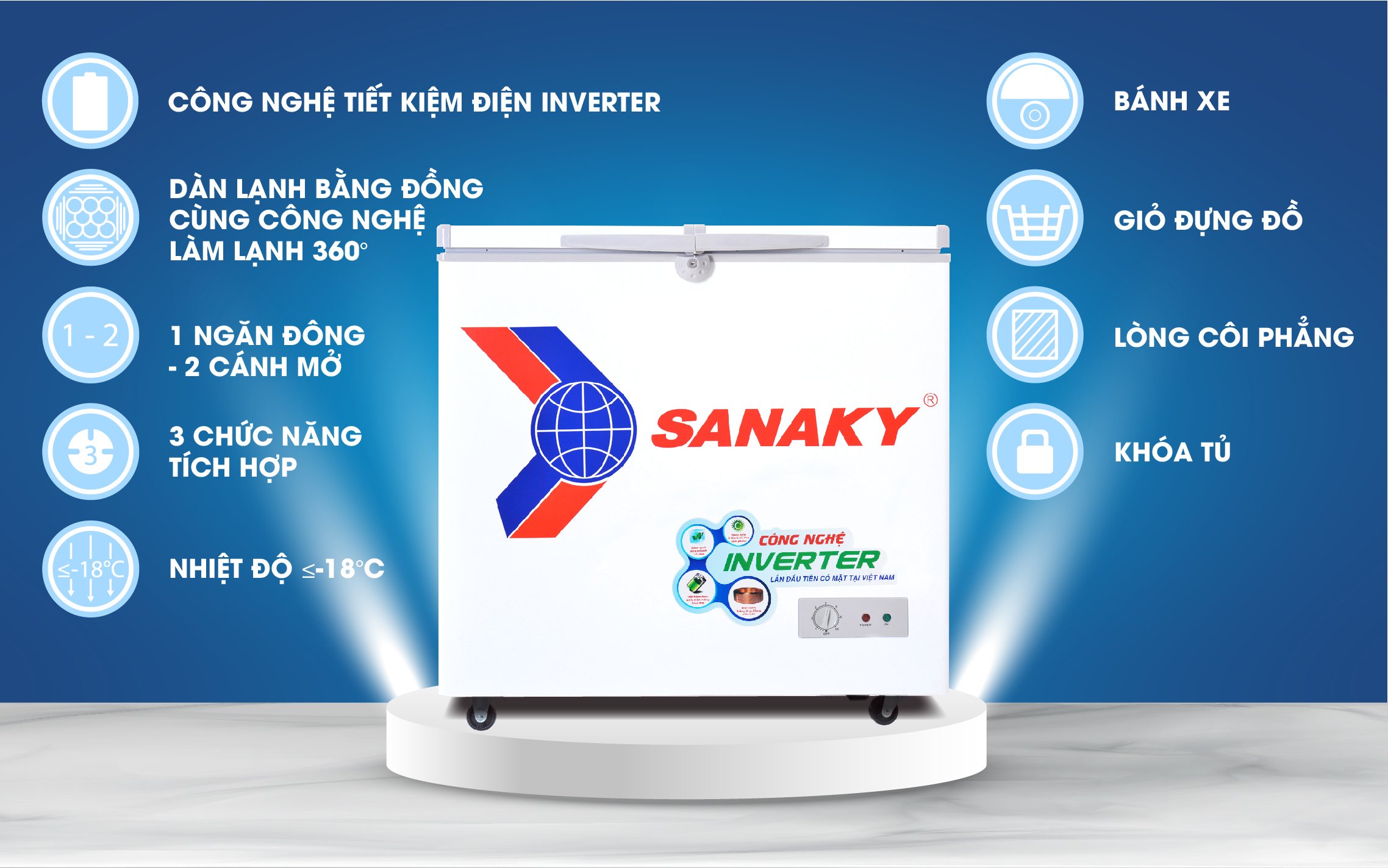 Tủ đông sanaky VH-2599A3 với công nghệ mới nhất, công nghệ inverter, máy nén biến tần tiết kiệm hơn 30% điện năng so với các sản phẩm tủ đông thông thường. Công nghệ inverter hoạt động với động cơ moto sẽ tự động điều chỉnh nhiệt độ tải được, cho tủ đông không tiêu hao quá nhiều năng lượng, tiết kiệm điện năng hiệu quả.