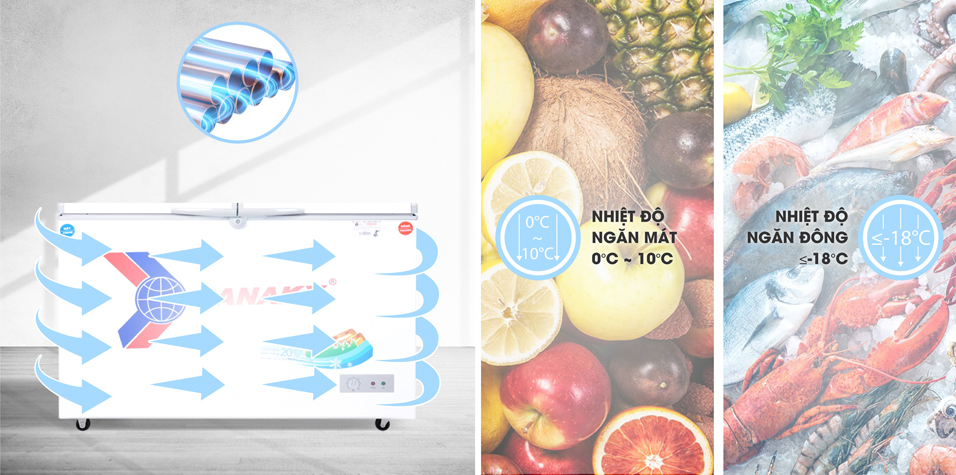 Thiết kế làm lạnh bằng dàn đồng, Kết hợp với hệ thống thân vỏ dày, giữ nhiệt, giúp bảo quản thực phẩm an toàn, tiết kiệm điện năng cho người sử dụng. nhiệt độ từ 0 đến -180c thích hợp bảo quản các loại thịt, cá, hải sản đông lạnh, kem, đá,... Ngăn mát nhiệt độ từ 0 đến 100c thích hợp bảo quản các loại nước giải khát, hoa quả,...