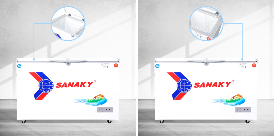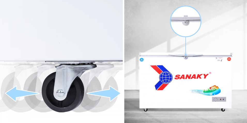 Tủ đông Sanaky VH-3699W1 có nắp lật vali có khóa, chân tủ có bánh xe chịu lực