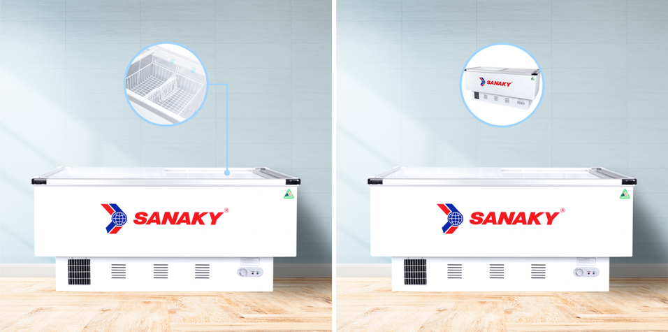 Tủ đông Sanaky VH-999K phù hợp với các siêu thị các cửa hàng vừa phục vụ cất trữ đông lạnh sản phẩm vừa trưng bày sản phẩm để khách hàng dễ dàng quan sát, với một ngăn làm đông rộng là sản phẩm tủ đông cỡ lớn trong dòng sản phẩm tủ đông một ngăn có nắp kính trưng bày.